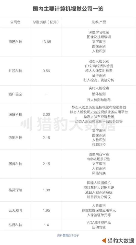 如果将图像理解看作计算机视觉的终极目标,那么现阶段的技术还非常初级。我们将计算机视觉划分为预处理、初级视觉、中级视觉和高级视觉4个层次,其中初级视觉的任务是找到图像之间的一致性,通过梳理计算机视觉领域的热门公司就可以发现,现在绝大多数公司提供的人脸识别、文字识别等技术,其实都属于这一层次。