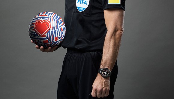 除了球员们脚下的智能足球,跟着满场跑的裁判员们手上也佩戴了一款表——Hublot 所推出的 The Big Bang Referee 智能手表。