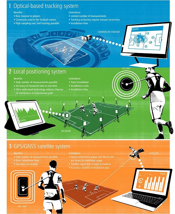 据 FIFA 官网的资料显示,「数字化表现和跟踪系统」主要是通过光学追踪系统,球员身上的 GPS / LPS 定位系统等三种方式记录数据,并为这次参赛的 32 支球队提供赛场上球员的数据,而这些信息最迟会在 30 秒内输送到主控台、板凳上的教练以及医疗团队手中的平板电脑上。