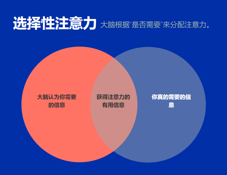 因为注意力是一种非常有限的资源,人不可能同时注意到所有外界信息,大脑总是会有选择地注意到某个信息,过滤掉其他绝大多数的信息。这在心理学上,这叫做“选择性注意力”(selective attention)。