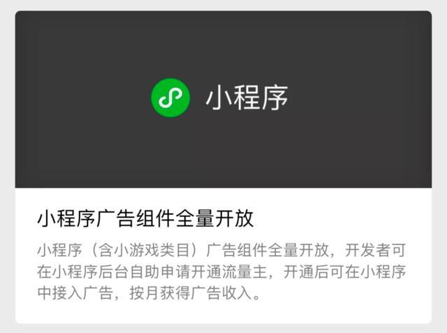 7月10日,微信官方宣布,小程序(包括小游戏)的广告组件已经全量开放,开发者可在后台自助申请开通流量主,然后就能在小程序里接入广告,按月获得广告收入。