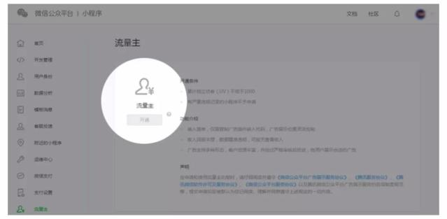 开通流程也很简单:进入微信公众平台小程序后台,点击左侧面板“流量主”,满足开通门槛的小程序开发者直接点击“开通”即可创建相应的广告位。