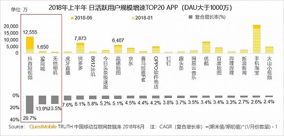 2.5 日活跃用户规模在1000万以上的APP中,抖音短视频、58同城和无他相机位列复合增长率三甲
