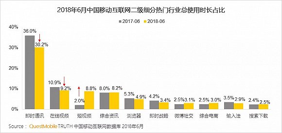 短视频“魔性有毒”,用户总使用时长占比同比增长3倍;虽然即时通讯和在线视频总使用时长均在增长,但是整体移动网民时长中的占比呈现下降趋势。