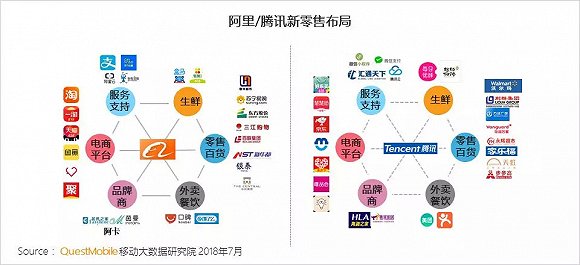 2017年以来,阿里、腾讯加大新零售布局力度,二者的布局思路和打法差异明显,阿里构建的是以自己为中心的强连接体系,而腾讯主要进行赋能,构建的是去中心化的弱连接体系。