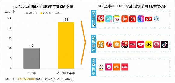 2018年上半年TOP20综艺节目中,互联网企业参与赞助了3/4的节目,主要赞助形式有花式口播、品牌露出等。