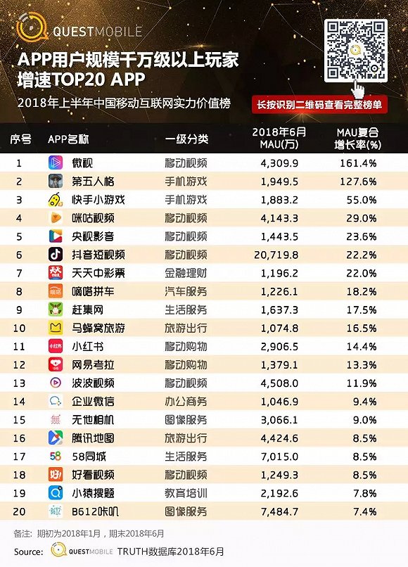 到2018年6月DAU在100万-1000万的APP中增长最快的是聚看点,这得益于社交裂变和平台补贴;微视受到腾讯大力扶持,到了2018年6月,日活跃用户规模已经接近350万。