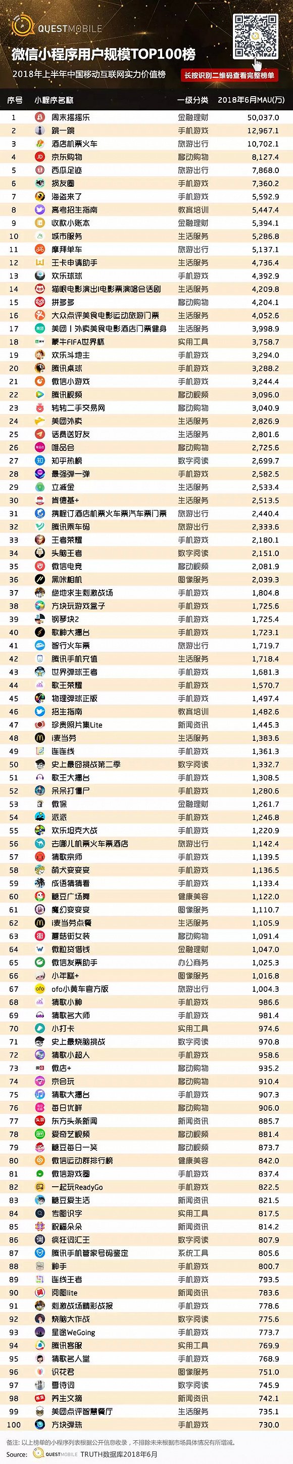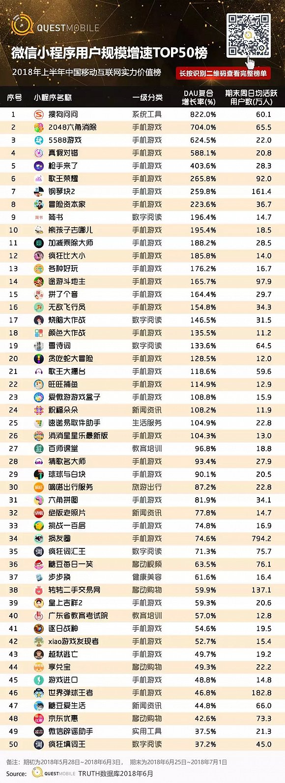 基于微信生态强大的社交连接基础,微信小游戏的发展如火如荼,平均每两三周就会有爆款小游戏问世。以6月为例,据QuestMobile数据监测,损友圈和派派是增长最快的小程序游戏之一,其中损友圈已跻身小程序2018年6月MAU TOP10 。