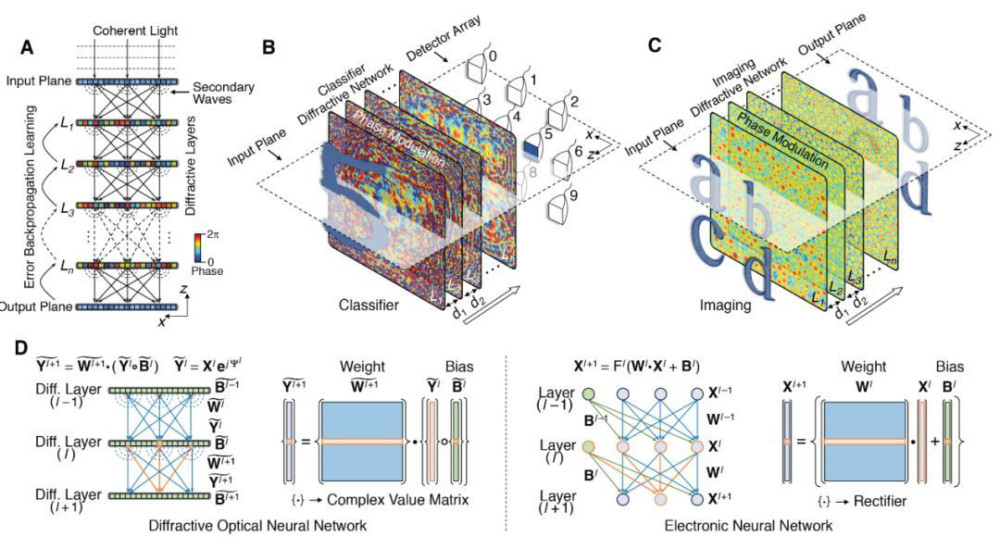 在用光执行运算的实验中,UCLA 的研究人员研发出了一个 3D 打印 AI 分析系统。这一系统可以通过光线的衍射来分析人工智能。研究人员也表示,通过改变相位和振幅,人工智能中每个“神经元”都将是可调的。