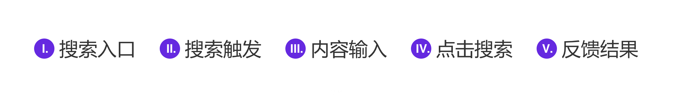 根据搜索的行为,可将其拆分为五步:搜索入口-搜索触发-内容输入-点击搜索-反馈结果。