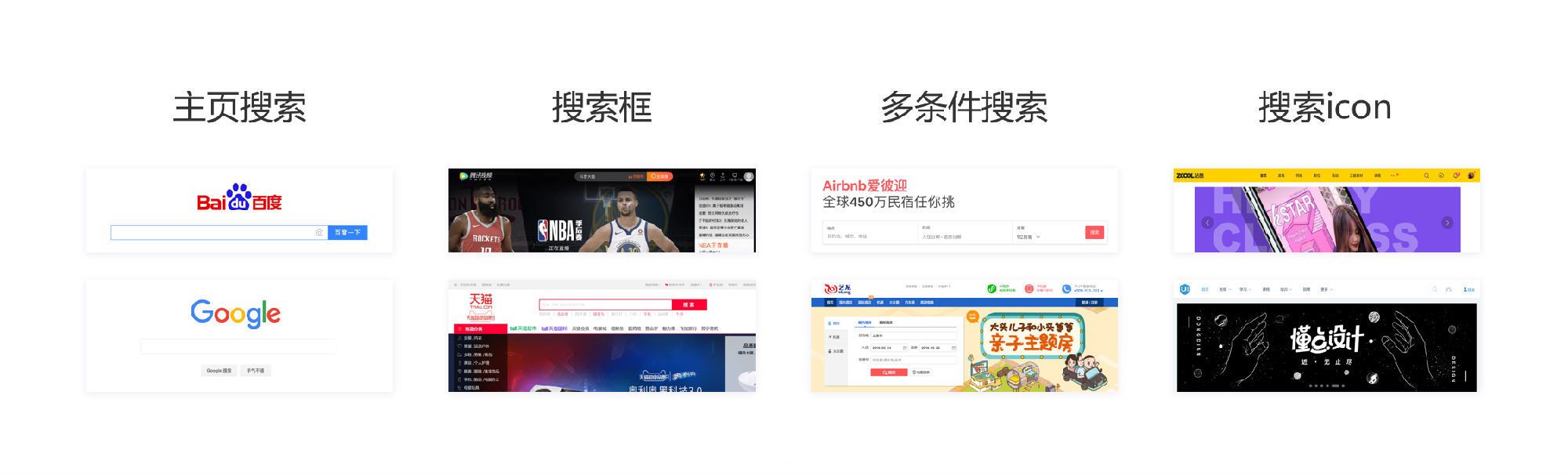搜索入口具有提示和引导操作的作用,主要类型有四种:主页搜索、搜索框、多条件搜索、搜索icon。