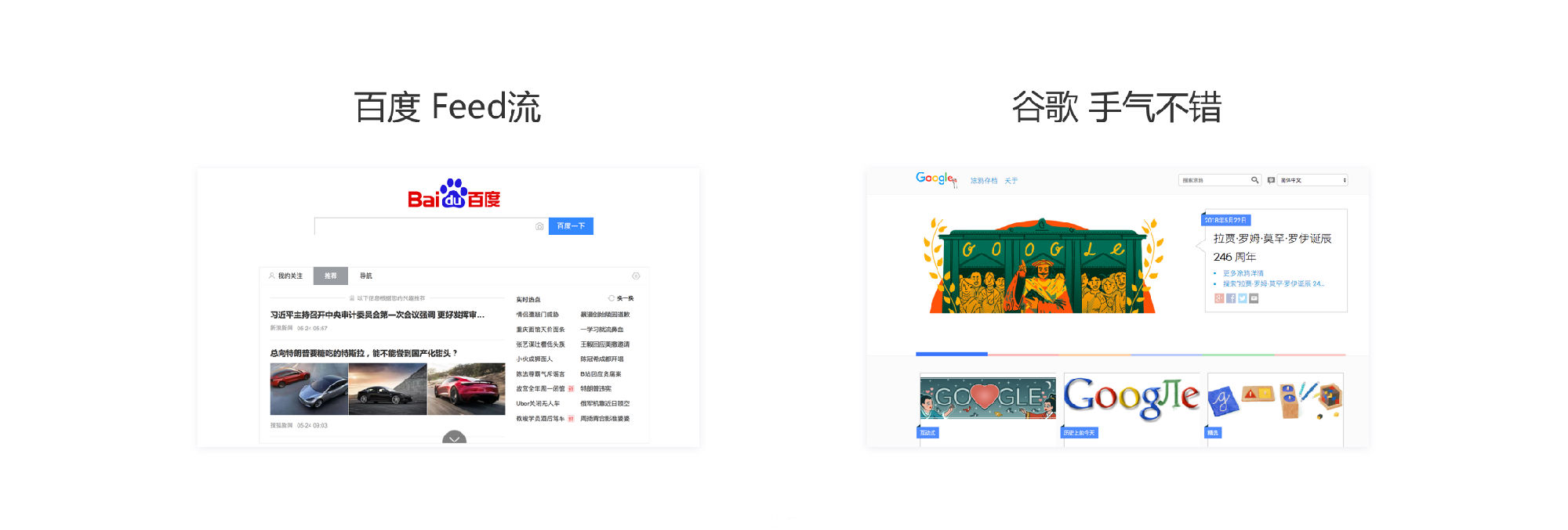 将搜索作为独立的页面,以搜索为导向,整个产品的使用围绕搜索这一核心功能功能展开。比较典型的如百度、谷歌等,搜索框功能强大,用户可以进行各种尝试。谷歌主页中的手气不错以及百度搜索的个性化推荐和新闻,为产品引进更多的流量,增加了用户黏性。