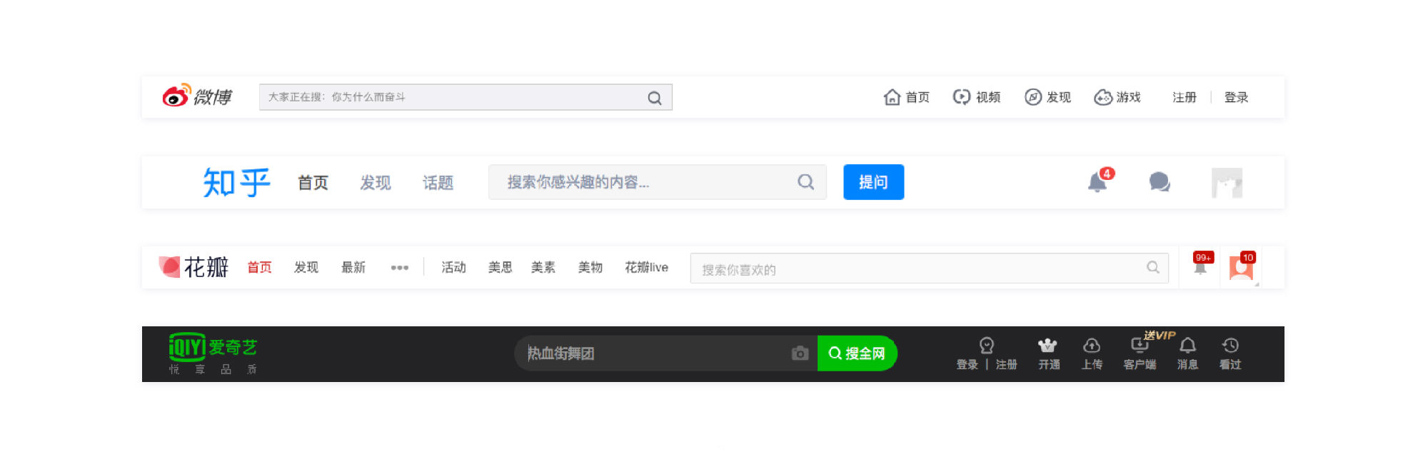 搜索icon的形式虽然可以节约导航栏的空间,但相对搜索框来说对用户的引导性较差,因此比较适合以搜索为辅助功能的产品。