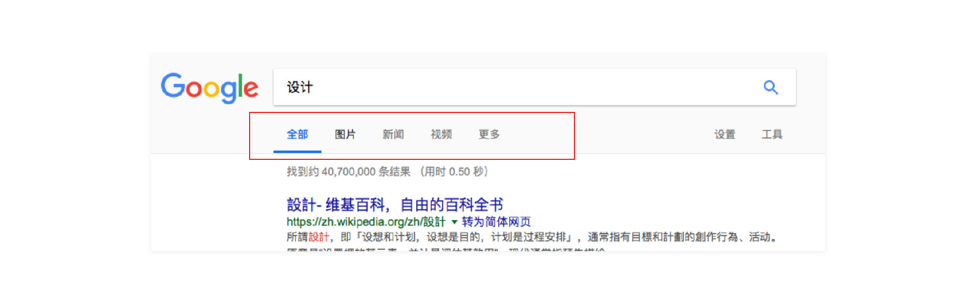 将搜索到的结果进行分类处理,一般采用Tab的样式进行归类,如谷歌搜索“设计”,将搜索结果按照“全部”“图片”“视频”“新闻”“更多”等进行了分类。