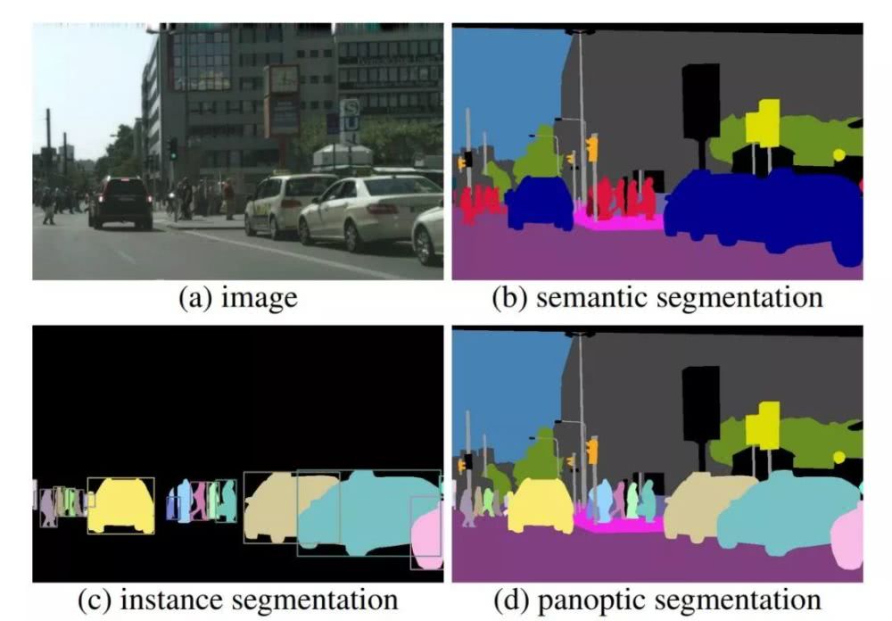 图二 (a)原图;(b)语义分割:识别天空、草地、道路等没有固定形状的不可数材质(stuff),标记方法通常是给每个像素加上标签 ;(c)实例分割:分割人、动物或工具等可数且独立的物体实例(object instance),通常用包围盒或分割掩码标记目标;(d)全景分割:生成统一的、全局的分割图像,既识别材质,也识别物体。
