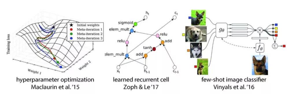 图五 元学习近期的进展。自左至右分别为元学习的超参数优化 、神经架构搜索 、少样本图像分类 。