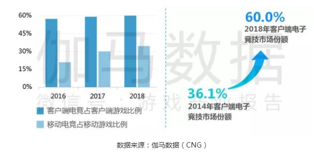 数据显示,移动电子竞技游戏市场具有较大潜力。 2016 年,移动电竞在移动游戏中占比不到20%,而到 2018 年,移动电竞在移动游戏中占比已近40%。虽然移动电子竞技游戏占比依然低于客户端游戏市场,但其还有很大增长空间。